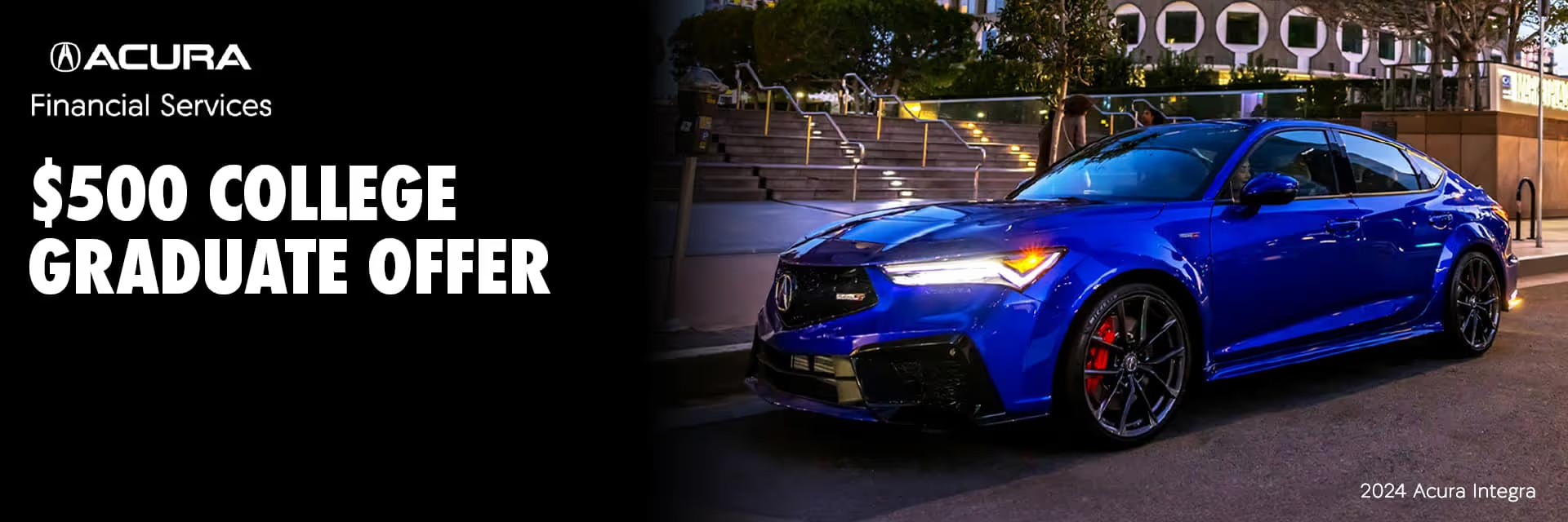 Acura would like to recognize your recent accomplishment by helping you get into the right luxury vehicle, with a $500 savings towards an eligible 2024 or newer ZDX or 2025 or newer Integra, ADX, TLX, RDX, or MDX vehicle when you finance or lease with Acura Financial Services (AFS) [1].